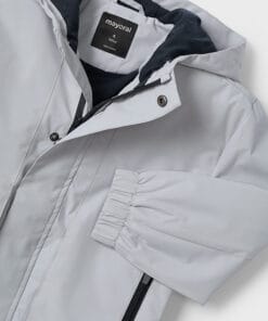 Chlapecká bunda Mayoral šedá s kapucou, delší, příjemný materiál, zapínání na zip, funkční kapsy. 100% polyester, podšívka 72% polyester, 28% bavlna