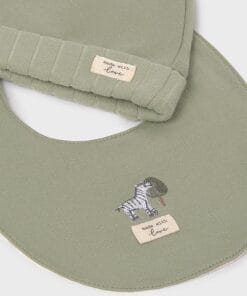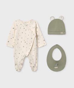 Dárkový set pro miminko Mayoral. Třídílná sada pro chlapečka – overal, čepička a bryndáček. U overalu je praktické a oblíbené křížené zapínání po celé délce pro snadné oblékání. Jemný potisk. Manžety rukávů u malých velikostí tohoto modelu (0-0 až 4-6 měsíců) mají efekt rukavic (ohrnovací rukávy). Roztomilá čepička – aplikované motivy oušek. Tento produkt je dodáván v krabičce z kolekce Newborn, ideální jako dárek při zvláštních příležitostech.