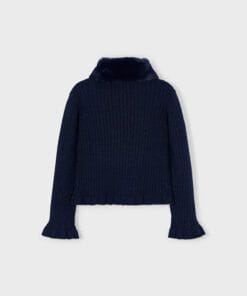 Dívčí svetr Mayoral s kožešinkovým odepínacím límcem. Využitelný pro všechna roční období a příležitosti. Barva modrá navy. Svetřík je lehce pod pas, krásně sladitelný se sukní, kalhoty a hodí se i k šatům. Svetřík, který obohatí každý šatník.