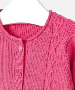 Dívčí pletený svetřík s ozdobnými knoflíky, vyplétaný vzorek. Nařasené lemování konce svetříku a konců rukávů. 80% bavlna, 17% polyamid, 3% elastan.