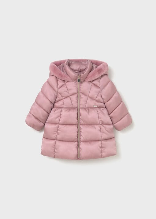 Dívčí zimní bunda Mayoral. Nádherná dívčí zimní bunda/kabát, vyrobena ze 100% recyklovatelného polyesteru, vnitřní jemný kožíšek, zapínání na zip, kapsy. Kapuce lemovaná kožíškem z umělé kožešiny. Zapínání na zip vpředu uprostřed. Měkká polyesterová podšívka.
