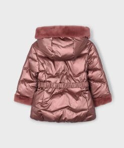 Dívčí zimní bunda Mayoral. Nádherná dívčí zimní bunda/kabát, vyrobena ze 100% recyklovatelného polyesteru, vnitřní jemný kožíšek, zapínání na zip, kapsy. Kapuce s odepínatelným kožíškem z umělé kožešiny. Zapínání na zip vpředu uprostřed. Měkká polyesterová podšívka. Metalický povrch. Elastický pásek s přezkou, který umožňuje individuální střih a maximální oporu v pase.