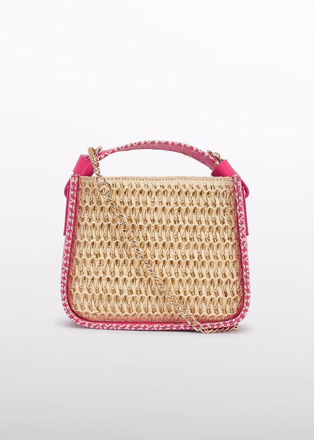 Kabelka dívčí Abel Lula k nošení v ruce i na rameno s řetízkem. Okouzlující růžová taška pro dívku z umělé kůže kombinovanou s proutěnými předními díly. Rozměry 15 x 19 cm h)