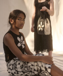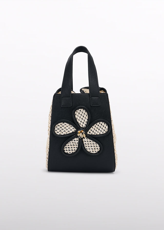 Kabelka dívčí Abel Lula k nošení v ruce. Okouzlující černá taška pro dívku z umělé kůže kombinovanou s proutěnými boky a našitou květinou. Na květině našité korálky Rozměry 21 x 16 cm (31 x 16 cm včetně uch)