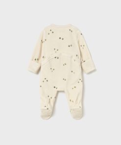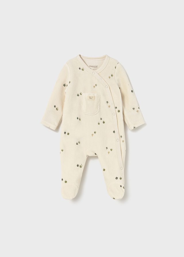 Kojenecký overal Mayoral. Překřížené a boční zapínání po celé délce se zapínáním na druky. Teplá bavlněná tkanina s měkkým, sametovým povrchem. Ohrnovací rukávy přes ručičky. potisk zelených a béžových bobulek.
