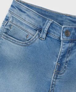 Příjemné, denim chlapecké kraťasy, elastický utahovatelný pas. Dvě funkční přední a dvě zadní kapsy. 79% bavlna, 19% polyester, 1% elastan