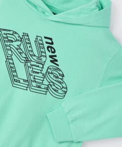 Mikina pro kluka s dlouhým rukávem. Límec s kapucí. Elastický lem a manžety pro lepší uchycení. Ozdobné prvky: text na přední straně oděvu. 59% bavlna, 40% polyester, 1% elastan