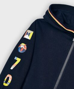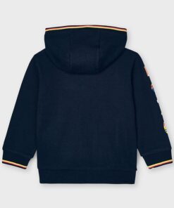 Mikina Mayoral chlapecká, logo na předním díle, obrázky na rukávu, kontrastní lem kapuce, dvě boční kapsy, 44% polyester, 55% bavlna, 1% elastan