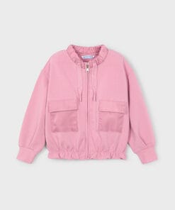 Dívčí mikina na zip Mayoral bez kapuce v pase nařasená do gumy, utahovatelná dekorativní šňůrka, zapínání na zip, dvě lesklé kapsy, 55% bavlna, 41% polyestrer, 1% elastan