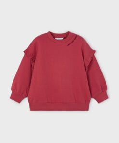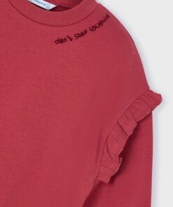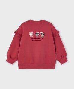 Mikina dívčí Mayoral s netradiční aplikací na zadním díle. Jemný nápis na předním díle, drobné dekorativní volánky.