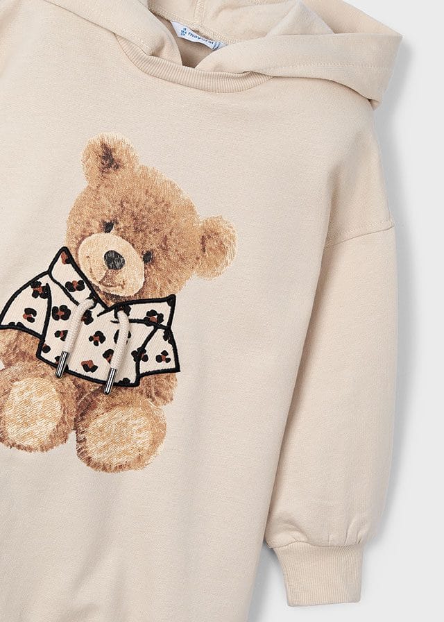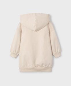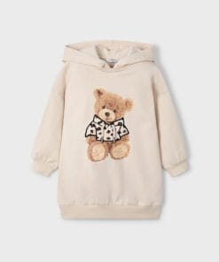 Mikina dívčí Mayoral dlouhá s kapucou a aplikací na předním díle. Teplá, silná froté látka (prošívaný fleece), ideální pro chladnější měsíce. Oděv lze používat i jako šaty.