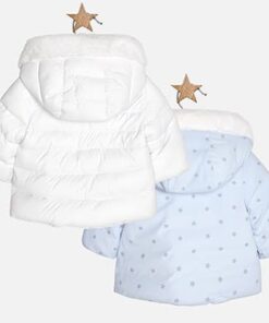 Nádherná bundička pro miminko, oboustranná bílo/modrá, v designu použitelném pro obě pohlaví, s kapuckou lemovanou kožešinkou. 100% polyester.