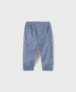 Dívčí lehoučké, slabé, dlouhé kalhoty Mayoral s puntikatým potiskem, do gumy. Funkční kapsy. Ozdobná mašlička v pase. Kalhoty širšího tvaru, nohavice do gumy. 100% bavlna.
