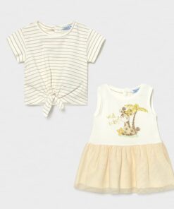 Šatičky na ramínka s aplikací žirafky, šifonová sukýnka, tričko na zavazovací ozdobný uzlík, s krátký rukáv, 60% bavlna, 35% polyester ,5% elastan, podšívka 92% bavlna, 8% elastan, tričko 92% bavlna, 8% elastan.