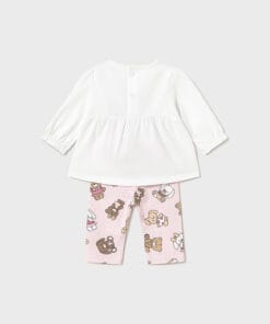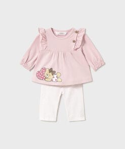 Set dvou triček a dvou sladěných legínek pro novorozence Mayoral. Tričko s dlouhým rukávem a elastickými manžetami. Zapínání na zádech knoflík a boční zapínání na druky pro snadné oblékání. Dekorativní prvky: design vpředu. Volánkový design. 95% bavlna, 5% elastan