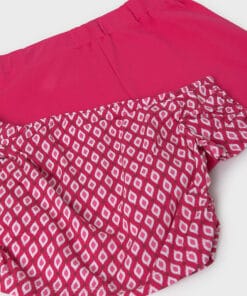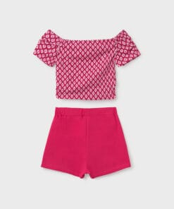 Set kraťasů do gumy, a nařaseného trička s rozšířeným výstřihem přes ramena značky Mayoral, krásná výrazná růžová barva,  95% bavlna, 5% elastan