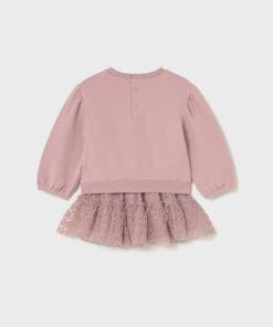 Set mikina a sukně Mayoral. Originální sada pro dívku. Mikina s volným střihem. Kulatý výstřih. Zapínání na druky vzadu. Dekorativní prvky: ozdobná aplikace. Sukně s elastickým pasem. Vyrobeno z lehké, průsvitné tylové látky. Nařasený a volánový design.