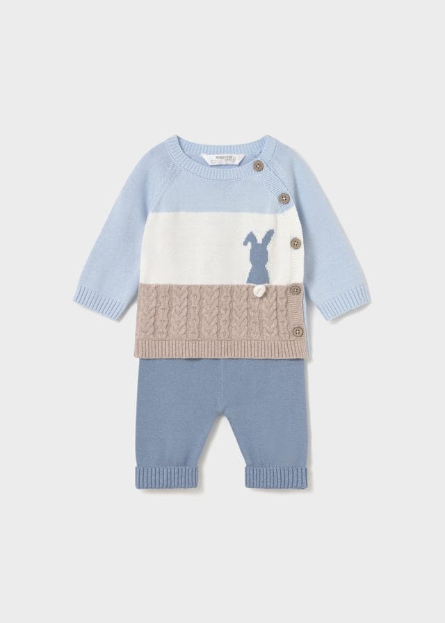 Set pro miminko Mayoral 2dílný – pletený svetřík a kalhoty. Dodáváno v krabičce.
