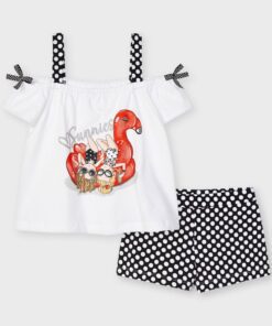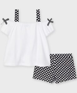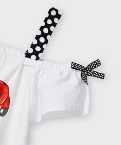 Set trička na ramínka a kraťasy dívčí Mayoral – potisk na předním díle, puntíkaté šortky s elastickým pasem, dekortativní mašličky, 95% bavlna, 5% Elastane.