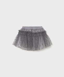 Sukně dívčí Mayoral. Tule sukýnka s elastickým pasem, stříbrnými puntíky a potiskem hvězdiček. Vyrobeno z lehkého, průsvitného tylu včetně vnitřní podšívky. Nařasený střih. Puntíkovaný vzor.