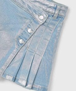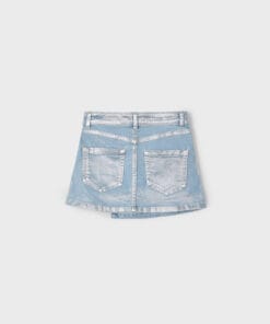 Sukně džínová dívčí Mayoral – vpředu jemně poskládaná denim sukýnka postříbřená. Typický zajímavý Mayoral design, který zaručuje oblíbenost a netradičnost a tudíž originalitu. Módní blýskavý vzhled dodá kousku šmrnc. Pas sukýnky je elastický a uvnitř stahovatelný. Zároveň je tam patent.