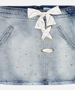 Sukně Mayoral dívčí denim. Sukně denim opraný efekt, ozdobné mašle, výšivky, kamínky, zip vzadu,