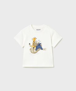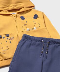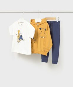 Tepláková souprava chlapecká Mayoral. Trojdílná teplákovka pro kluka, která se skládá z mikiny, tepláků a sladěného trička. Mikina s dlouhým rukávem a kapucí. Zapínání na zip vpředu uprostřed. Tričko s krátkým rukávem a zvířátkovou aplikací.