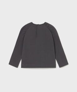 Tričko dívčí Mayoral s dlouhým rukávem pro miminka. Kulatý výstřih, jemné řasení. Zapínání na druk vzadu.  Zdobení: dekorativní aplikace, třpytky, sítotisk.