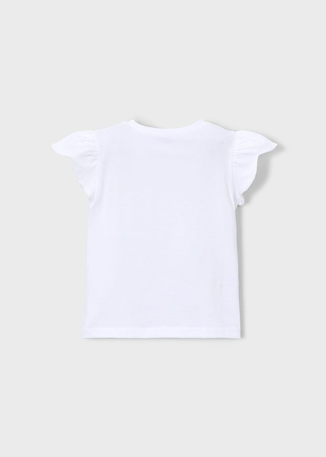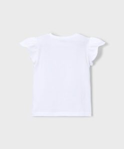 Tričko dívčí Mayoral. Toto dívčí tričko Mayoral v klasické bílé barvě zaujme krásnou aplikací na předním díle, která dodává celému outfitu hravý a moderní vzhled. Nařasené rukávky doladí elegantnější vzhled.