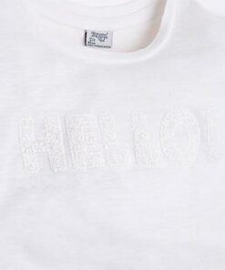 Bílé, velmi příjemné tričko s krajkovým nápisem Hello na předním díle, krajkové lemování rukávů a konce trička. 50% len, 50% lyocel.